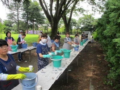 2019年8月18日(日曜日)、「夏空のような澄んだ空の色! 藍の生葉でシルクのポケットチーフを染めてみよう!」と題した「藍の生葉染め体験」が行われました。 王国の畑の一画で栽培した藍を使って毎年行われている教室です。 今年は、まず参加者全員でシルク製のポケットチーフを染色し、その後、参加者の方各自が事前に決めた「自分で染めたいもの」を染めるという形式で行われました。帽子やTシャツ、タオルにエプロンなど、それぞれ藍色に染められて新しく生まれ変わることができたようです。 当日の教室の模様を以下に順を追って見ていきましょう。