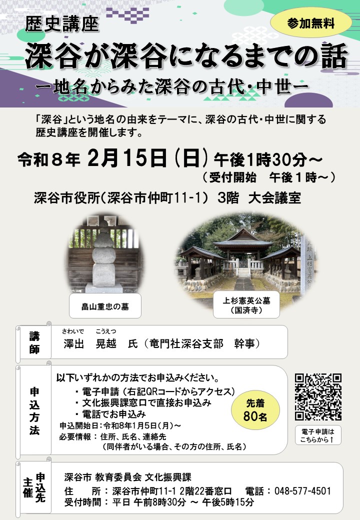 1.電話(文化振興課:048-577-4501) 2.窓口(深谷市役所2階 22番窓口 文化振興課) 3.電子申請(QRコードからお申込みください) URL: https://ttzk.graffer.jp/city-fukaya/smart-apply/apply-procedure-alias/rekisikouzaa ◆定員になり次第受付終了となります。