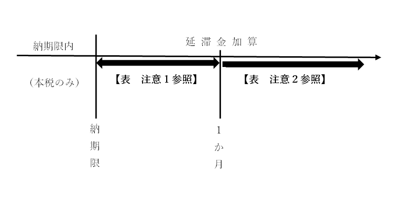 納期限の翌日から1か月以内では延滞金特例基準割合に1%を加算した割合(上限7.3%)(注意 1)となり、1か月を経過した期間は、延滞金特例基準割合に7.3%を加算した割合(注意 2)で計算されます。